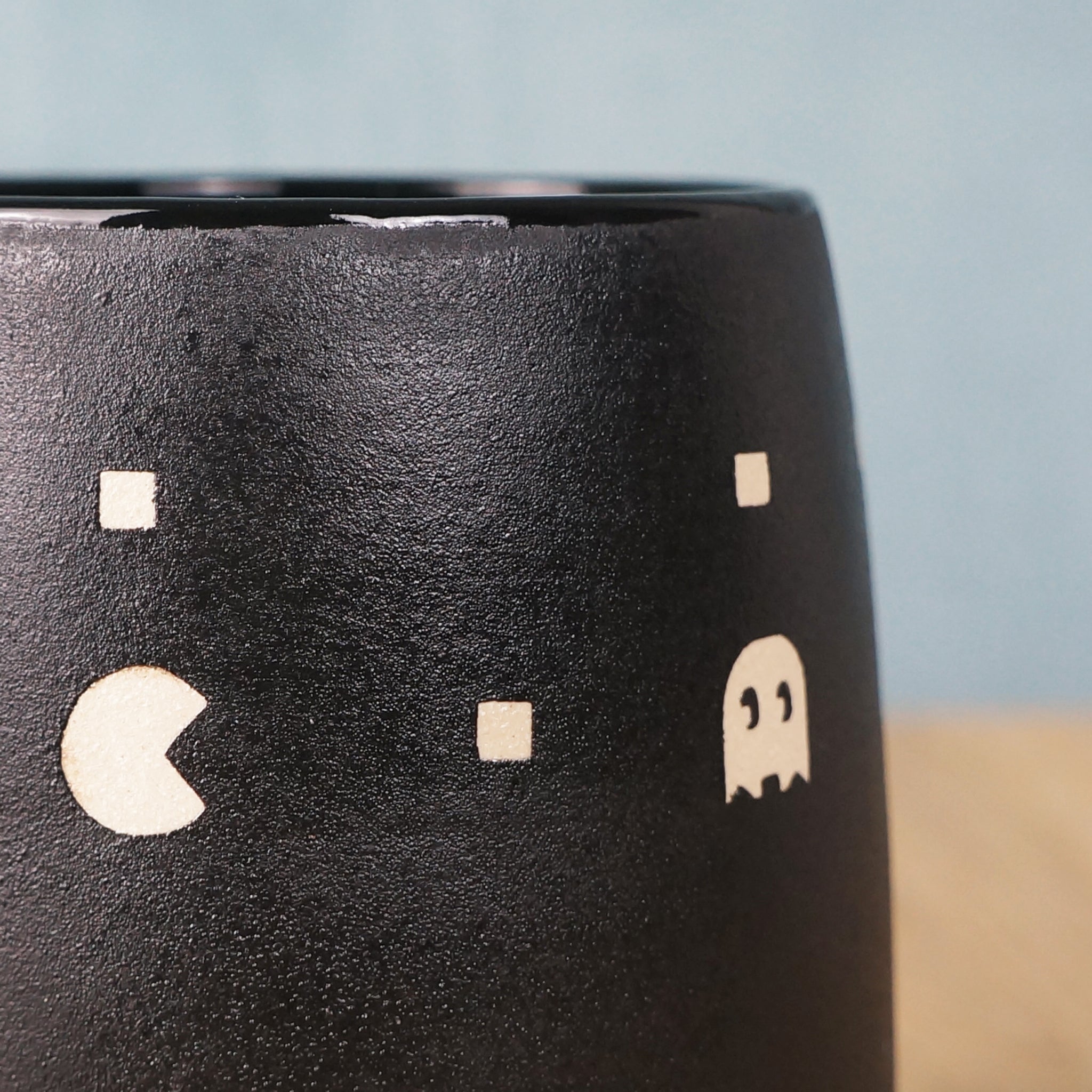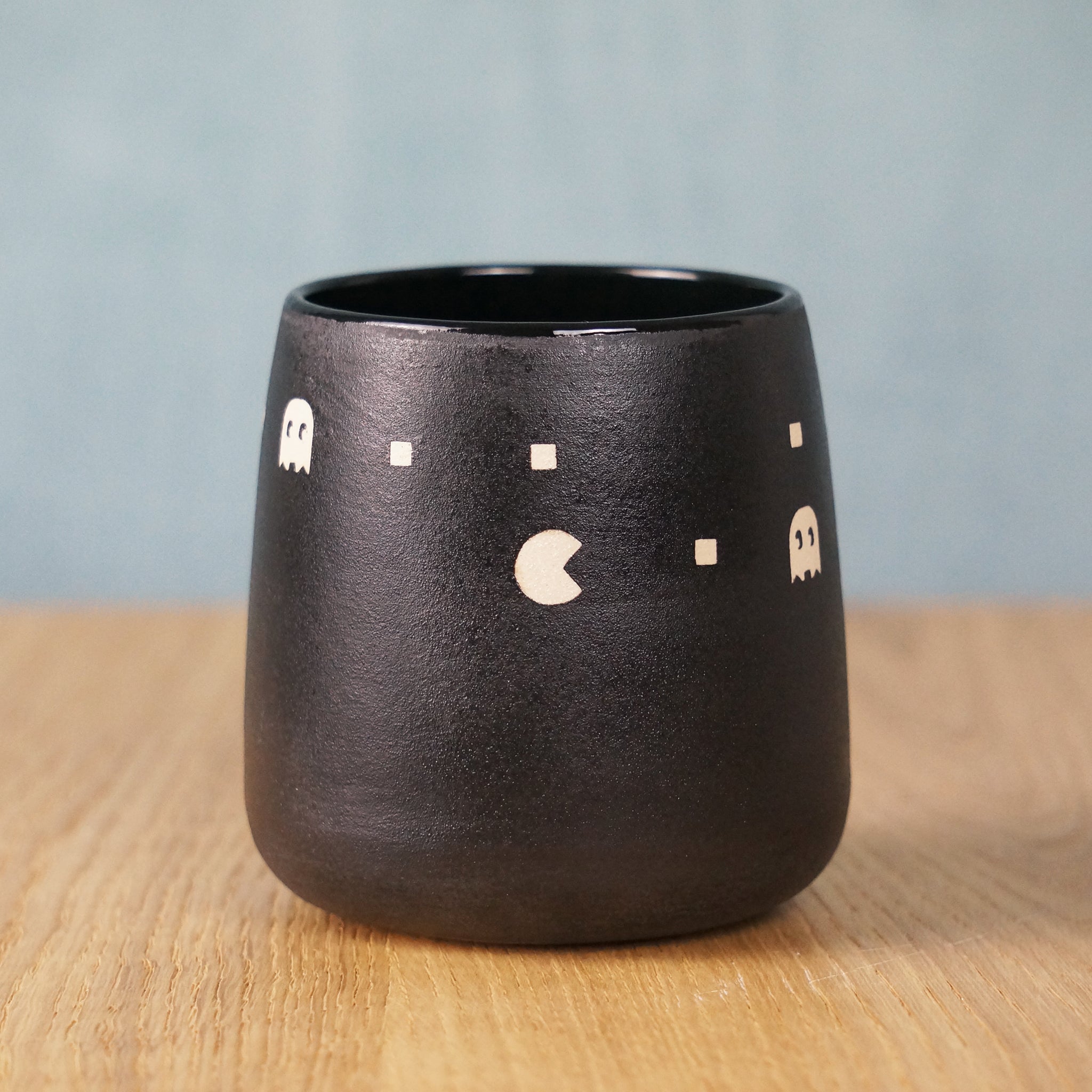 They are the ideal combo of a handcrafted mug with the sharp graphic lines of the iconic pac man aliens. I curve the bottom of the mugs so it creates a comfy fit in the palm of your hand. And they stack!